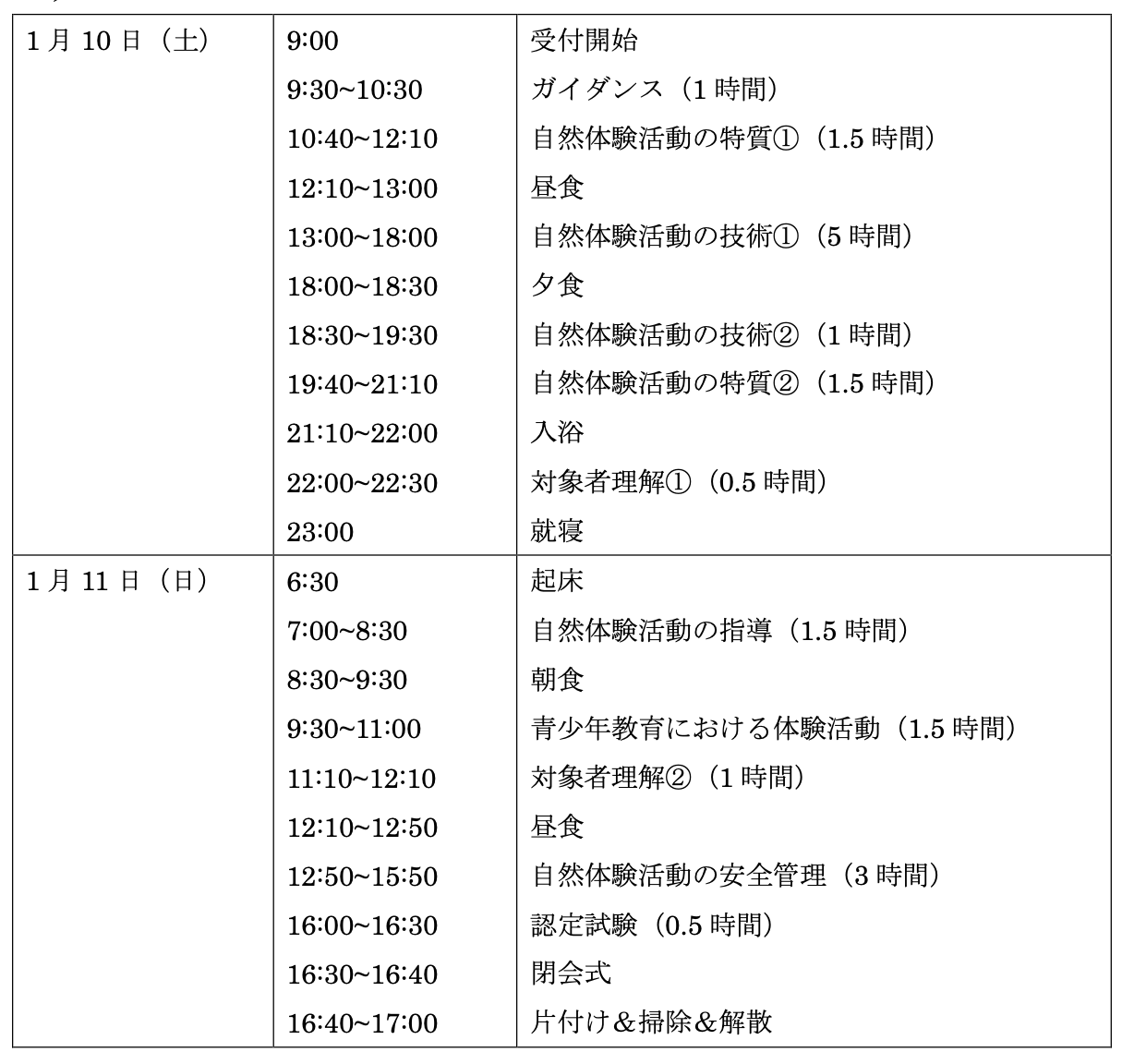 1日目 1月10日(土)9:00集合〜23:00解散